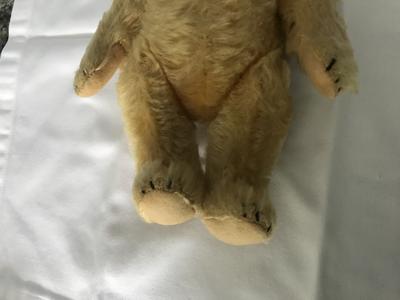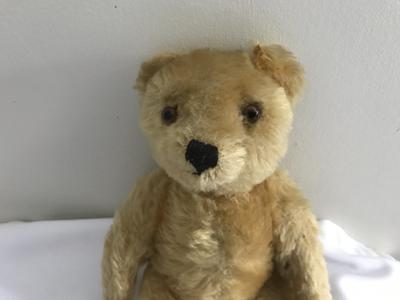 Possible mid 1950s (could be later) golden mohair bear with amber glass eyes, 4 stitched claw. Snout stitching appears almost square. On front and the back, the teddy bear is a centre stitched. The bear is 9 inches in length. The pads are light beige. The snout does not appear to be very pointy. There are no tags or markings on the bear. The eyes are original and one is loose and has a small circular wire with golden thread attaching it to the inside of the head. This bear and the Punkinhead bear its sitting beside wet in my family since the 1950s as one family member was born in 1951 and I believe Punkinhead belonged to him. I am not as definitive about the possible 9 inch Steiff bear as to what exact date he came to our home. The bear could even be from the early 1960s so hoping it will be identifiable here. Thank you.
