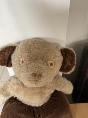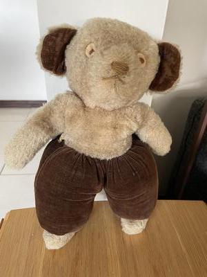 The bear is in good condition with a little wear on the velvet ear liners and where the trouser seams meet.