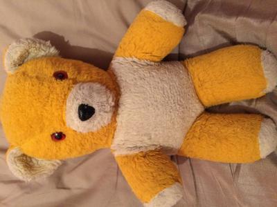 Lucky has no labels or tags, he has a yellow head , arms , legs and body with a white muzzle, tummy , four white paws and ears . He has reddy brown eyes with black pupils and a black plastic nose. I think he may be a Tebro teddy of sorts.