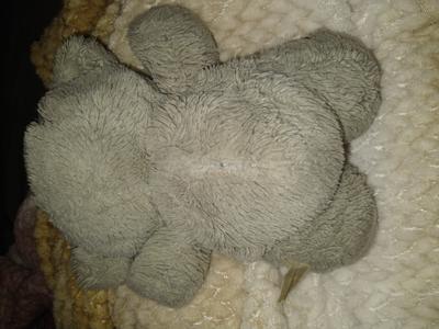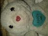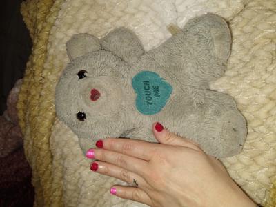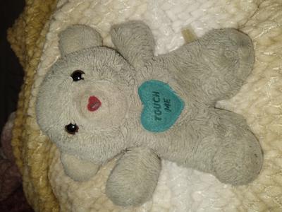My husband received this teddy bear when he was born December 1989 at a Beloit Wisconsin hospital. Original color is baby blue the sound box is a push button (not wind up) plays Henry Mancini, Love story. On the stomach is a dark blue heart patch that says touch me, his nose is red and heart shaped as well.