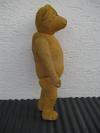 I purchased this very large antique teddy bear and was told he was made around 1920s with humpback and glass eyes. I purchased him in Germany. His head has 3 seams, measures 75 cm tall and has a honey-colored short mohair coat. His ears are placed on the sides of his head, paws and feet have 5 claws embroidered black, the nose is cross embroidered. He has large, flat glass eyes. Paws are made of fabric. His voice does not function. His arms are long, the body is very stocky. His 5 joints have discs,no tears, no damages except his voice, and a little coat abrasion. The paws were replaced long ago, but it still is very old fabric. He comes dressed in a authentic German Cow Lederhosen, and wool sweeter, I am not sure if these items are original.