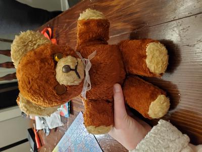 In spots where he is less worn we can see that the fur was actually shiny at one point. It is possible he had a tag under his right arm at one point. The stitching appears different here.