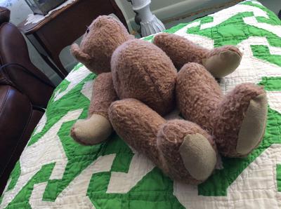 This articulated limb teddy was acquired in Germany as a gift. It is very old, but age unknown. Manufacturer unknown. The pads of the feet are a beige/cream color leather. The brown body is covered in short brown looped fibers that look faux, not real hair. Arms are about 7 1/4” long, legs 7 1/2”. Arms and head attached by metal interior to the joints. Limbs and head have full 360 degree rotation. Ears have rounded, half- circle appearance. The nose and mouth are black thread. The eyes are smooth black glass buttons. The face appears flat because the nose and mouth are directly on the surface of the round head instead of on a protruding muzzle. The lack of a muzzle gives an appearance that is different from the look of a traditional Steif bear head, while the body does have the traditional look. The bear can sit upright. Laying down, the full body length is about 18”.