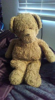 This bear was given to me when I was really little, neither my aunt nor grandma remember particularly where he was bought. He has a tan material that i think is either wool or mohair he use to have a red or green bow, which has since then gone missing. I'm not looking to sell, but I just really wanna find out where he came from to maybe if at all possible purchase a similar one for my kids since mine is kind of old and falling apart. His eyes are simple black beads that I am sure are sewn into his head since they have never come out. His limbs, and his bottom are filled plastic beads I am guessing. Otherwise his head and torso are filled with stuffing, however I'm not sure if its cotton. I had gotten him wet quite a few times as a child but it never developed any kind of mold, nor did the material he is made out of. His left foot isn't an original part of him, so that's why it looks different. My grandma had to make him a new leg after the dogs got to him. But yes, I provided a picture of him know, let me know if you would like a picture of him when I originally got him, I might have search through old pictures