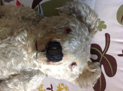 I'm hoping someone can help with more information about this bear. It's 65 years old, my mother was given when she was 5 years old. The pads were replaced around 1975, and the growler will still work but only occasionally. It's rattling around inside which it never used to do. It's got no labels on it and it's looking a bit bare of fur in a few places. He's got a hole in his right leg which I've taken a picture of as I'm not sure what the material inside him is. His left ear is now falling off so he's not in the best of condition but I'd love to find out more about him as he's quite an old chap now.