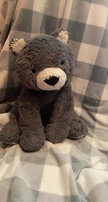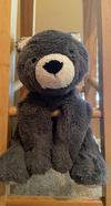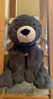 I found blue at a thrift store and he was a bit damaged. I took him home and fixed him. I’ve always wondered what kind of bear he is and if he is apart of a brand. He is blue with white ears and white paws. His paws have a design on the bottom and he’s made to be able to move his arms around. He is a grey blue color.