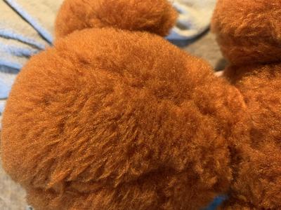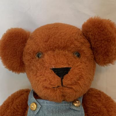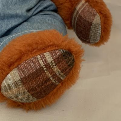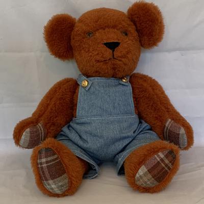 I bought this bear at a local thrift store. He has plaid paws and a denim colored outfit. He has poseable arms,legs and head. There is no identifiable marks or labels. He is in perfect condition and is very clean. I will include a picture of how he is stitched together hopefully someone will recognize the technique. He has brown eyes , rusty brown colored fur. He does not look homemade. He feels like he has really firm stuffing. He is about 17 inches long and 9 inches wide at shoulders. He has a black sewn