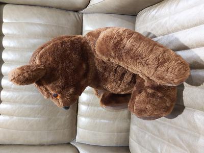 He has dark brown soft fur,eyes with orange/red around the outside,he has half suede hands and full suede feet.his growler is working when tipped upside down.His nose is stitched with a very thick kind of black string and looks a bit messy,a loop comes down from his nose stitching down to his mouth and his mouth stitch goes through that.he doesn't have any markings or labels.