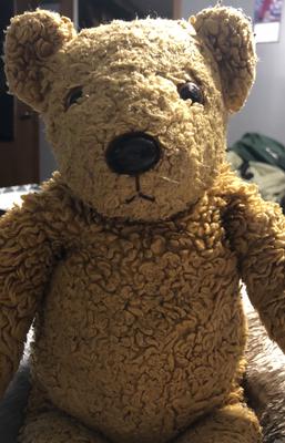 ive had this bear ever since i was little...and since then my mom has had to replace the hands and feet with denim and his nose has peeled away. it once had been either a super soft leather/ suede as were is hands and feet. he also use to have a growler/snore box in his back.
