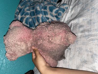 It’s a pink bear, its fur is individual somewhat thick strands that kinda resemble noodles. It has a think light pink strand of chiffon like fabric around it’s neck that’s tied into a bow in the front. On its face, where the eyes mouth and nose is located, there is no fur, it’s a white circle of white velvety fabric. It has 2 black beads for eyes. On the bottom of its feet, there is no fur, but rather 2 white circles of the same velvety fabric that’s on its face. It has a little round tail, and it was given to me as a gift at the hospital when I was born on October 2, 2003. I believe it was bought at Burlington.