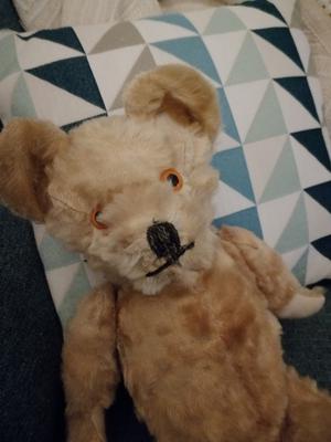 Cathy dates back to roughly 1960 and I have had her since I was born in 1965. My mum renovated her about 30 years ago but she retains the same look as I remember. She is golden and has a stitched nose. She has jointed hips and shoulders and her head rotates. She used to have a squeaker in her tummy which 'roared' when I turned her upside down but this no longer works. She has been greatly treasured over the years. I wonder if she is a Pedigree bear?