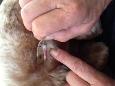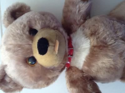 He has a red buckled collar but I'm not sure if this is original. He did have a red and white label under his right arm unfortunately it as been cut out.
