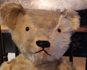 He measures 24" and has movable head and limbs. He's excelsior stuffed. Eyes are glass, though are slightly different, so one - or both - probably replacement. Nose looks re-done, and there was sewing on his back seam that is a repair. Even so I thought he was too darn cute to leave in that antiques store! He was wearing the red ribbon with antique pin that says "Committee" and another pin that commemorates the August 1913 assembly of the Lahambra, Penn. Beneficial Society. Seems he served on a committee! :)