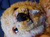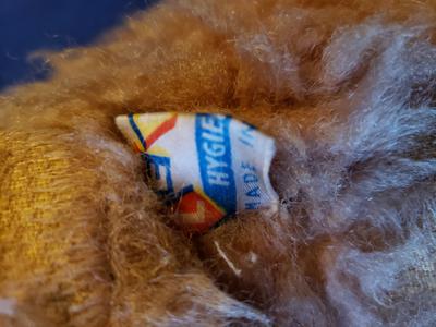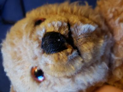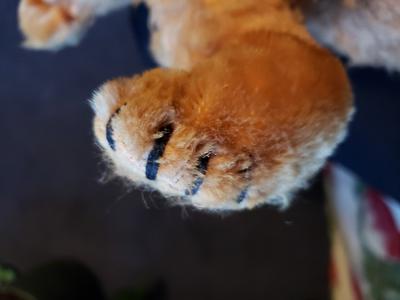 I was given this bear as a young child. He originally would growl when you tipped him back and forth but that stopped years ago. Teddy has an embroidered nose and mouth, embroidered claws (4 on each appendage) and plastic eyes. The pads of his feet and around his mouth are are a shorter type of hair. It feels like his tummy is filled with straw or something similar though his head and appendages feel like they are stuffed with something different.