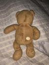 The bear is around 9 inches from feet to head. He has a light brown stitched nose and had black eyes with a little brown around the outside of them. He also has a rattle inside of him and has a cream/white oval shaped plastic logo fixed into his but with red lettering. Most of the lettering has worn of due to age and all I can make out is (‘s) in the first row and a huge “c” right below that. I’ve had him as long as I can remember I was born in 2002 so he is at least that old as well.