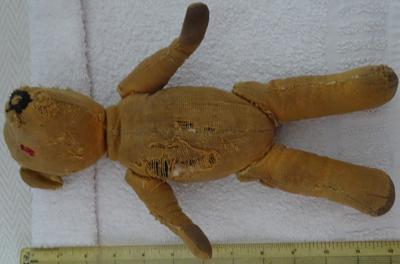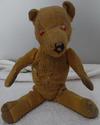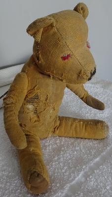 He is well-loved and it shows his head is wood shavings and his body is stuffing the arms, legs, and head still move you can see that he was covered in fur but has vanished with use and love.
