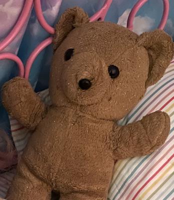 He is standard mid size bear, not overly small but the right size for a small child to sleep with. He has flattened out over the years as I used to sleep with my head on his back to keep away bad dreams. His dark eyes are hard glass and his original nose was also a hard plastic material though it fell off during childhood and my mother sewed a button on to replace it. His tag has long worn away so I do not know what brand he was originally - only that he was purchased from Motts likely between 1990-1995. Possibly the most unique identifying feature of this bear is that he has silver strands of fur among his regular brown fur. These pieces seem to be sewn into his fur and look sort of like small pieces of tinsel like you would find on a Christmas tree. He has never been in any other position than the one that is pictured (I.e. he didn’t ever sit, he’s always been flat). If I recall he was not overly stuffed when new, nor was his hair much longer than it appears in the attached picture.