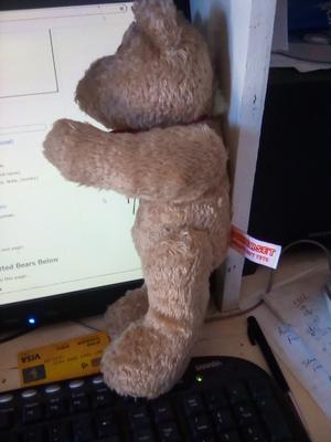 the teddy bear is light brownish in colour, with movable limbs have a red bowtie. have glass eyes. overall lenght is 30cm from top of head to tip of toes. legs is 13 cm in lenght and arms is 13 cm. arms and legs is movable.