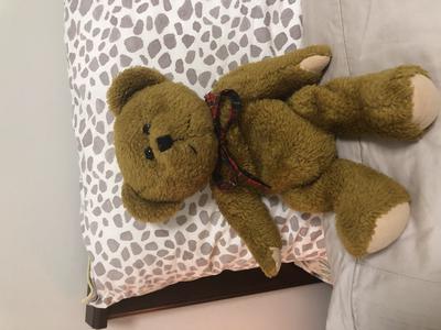 I’ve had my childhood teddy bear Monty since I was about 5 years old. He’s 5 way jointed and his fur is made from wool. My parents bought him up in Montville Qld and so that’s why he was given the name Monty. When my parents bought him my mum said he was sitting on a dresser in the back of the toy shop. My mum and dad loved his face which is why they chose him. According to my mum he wasn’t cheap. Monty is a big part of my life and has helped me with my depression and anxiety. He’s so special to me as he was given to me by the 2 people I love most and who have given me such a wonderful life. I’d really like to know who made my Monty bear as he never came with a tag so I don’t know the makers or the company.