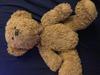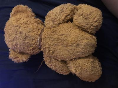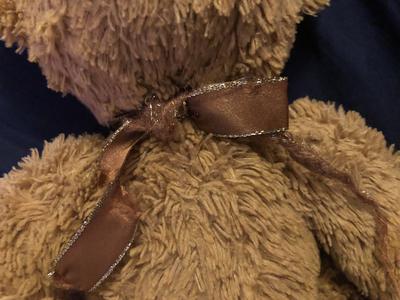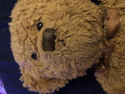 I never knew where this bear came from and it has no tag. It is a brown bear with two uneven mostly black eyes with a brown outline on the iris. It's full is slightly matted from time so it might've been fluffier. It has a brown bow tie that has a good sparkle outline. The bow is not sewed nowhere in the neck iexept for the knot part of the tie. A threaded nose with a patch of fur on the snout much shorter then the rest of the fur (same on the bottom of the feet) and half circle ears. :O)