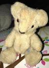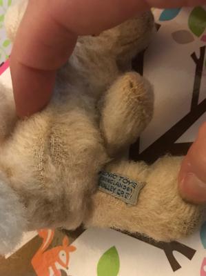 I have this cute little teddy, he is about 9cm (3 inches) tall. He has glass eyes, black pupil and orange(amber) outer. His nose and lips look hand stitched. He is covered in Mohair, which is worn in places, think he is stuffed with kapok(sorry about the spelling) his joints does not seem to move, so he stays in the sitting position. On his left leg(right if he is facing towards you) he has a white label with blue writing, stating.