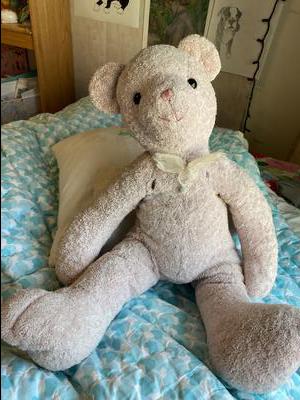 Hi everyone, this is Ted! I got him 18 years ago at what I think was a Big Lots, although I'm not completely sure as this was so long ago. He's pretty big, about 2 feet tall. His bowtie used to be pink too but it's faded over the years. He has little pellet bags in his feet and he used to have a small tag on the seam between his butt and his right leg. His feet used to have 3 toes but the left one has lost its stitching to time, and now has none. I think he also has a counterpart, a light blue bunny which was the same size and exact same material, but she was lost a while ago, so I'm unsure of that. Since he's so old I'd really love to know where he came from and if there are other Teds out there. So far, I haven't found a trace of him on the whole internet. Thanks for your help!