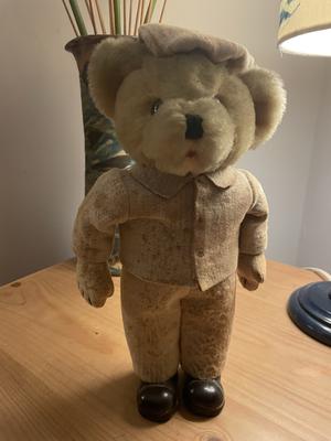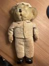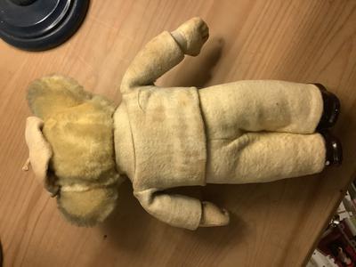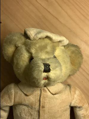 Mr Ted was my father’s bear. He dates from at least 1933. He is wearing a velvet suit with a cap or beret. These are not add-on clothes, they are part of the bear as made. His boots appear to be made of wood.