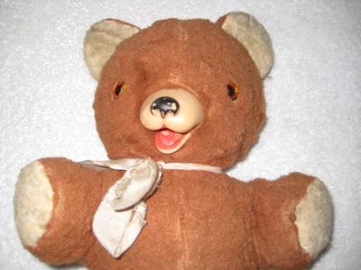 The bear has a faded ribbon tied in a bow around its next; and the brown glass eyes and plastic, smiling snout mentioned earlier. Otherwise, it is all soft brown fur, with white oval insets in its ears, paws, and feet. The fur has a very short, smooth knap.