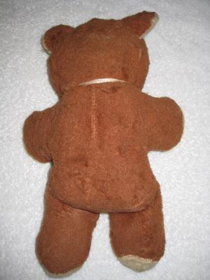 This is a soft bear, obviously stuffed, but the stitching remains intact even after 57 years, so the type of stuffing remains a mystery. When you squeeze the bear, it feels firmer than modern stuffed bears, but still yields in a smooth steady motion; much like pressing your fingers into your stomach. The are no lumps or texture that can be felt inside the bear.