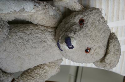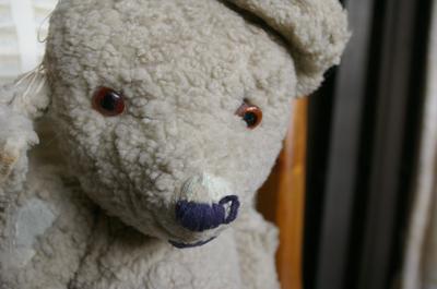 White teddy bears seem very rare and this one has probably either been through the 2nd world war or just after. If anyone can throw any light on the origin or history I would be very interested to find out. Sorry if the picture is not the right way up !