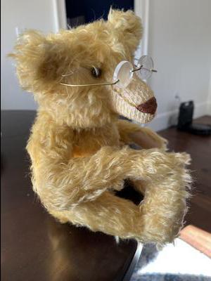 He has no tag, but I can tell he has a 5 disk limb system, glass eyes and a humped back. His glass eyes are painted with black pupils, the bottoms of his hands and feet are felt, but there is no "toe" stitching. He is yellow/blond with a brown hand stitched nose and mouth. There is a pair of glasses on the bear with a plastic lens. One side is sewn on. His limbs are long, as are his feet and paws. His bottom feels weighted with pellets (?) while the rest of him is very firm but soft.