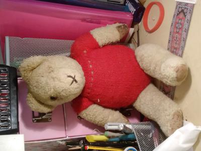 I was given Teddy Wardman by a neighbour in about 1955. He was not new then. He has no labels. He seems to be made of sheepskin with suede paws. I knitted him a romper suit when I was about 10. He's quite scruffy and worn with one eye missing. I remember being sick on him several times and he was well washed. His left leg is loose. I am torn between restoring him or just cleaning him. Any opnions gratefully received. I live 8n Spain and would be a little nervous bout posting him at the moment. I visit the UK a couple of times a year in normal times, so would hand deliver him for repear.
