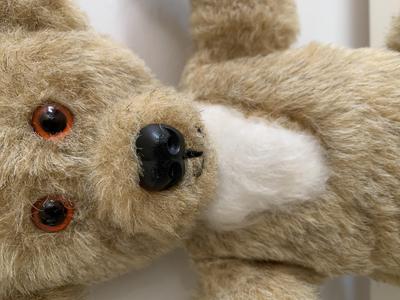 Plastic black nose with nostrils anchor shape stitched mouth. His nose and mouth are on separate round filled fur attached to his face. No tags