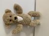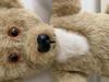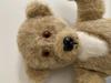Unjointed , beige colour with black fleck throughout also a upside down triangle of white fur below his head on his chest, firmly filled like padded. Orange eyes with large black pupils could be glass.