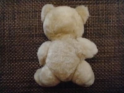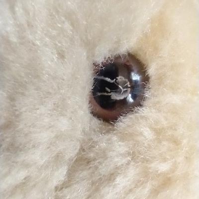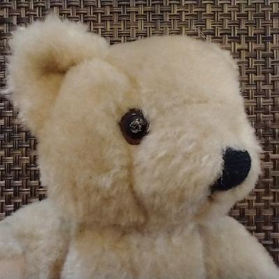 This is a small 6" light tan/beige bear with jointed arms and legs. It has a movable head that spins 360° at the neck. Body is firm. No tags. Looks vintage. Has interesting eyes. I do not know much about teddy bears so I am not aware if these type of eyes are common. They feel like plastic but may be glass. The middle of the eye looks like there was an instrument inserted inside of it (from the back of the eye) to create a hollow section for the iris / middle of the eye. Or it could be something just inserted and still there in the middle of the eye. See photos. The nose is black and the nose stitching appears horizontal. Any information about this bear would be highly appreciated.