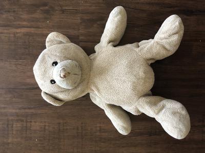 This bear simply named “Teddy.” He belongs to my 13-year-old daughter, I have no information on where he came from or who gave him to her. She’s had him all her life. He came home with us from the hospital and possibly could have been a gift from the hospital. My daughter was born in February of 2007 at Medical City in Dallas, Texas. He used to come everywhere with her. His head is now floppy with no stuffing in the neck. His head is still completely stuffed. The stuffing in the beginning of his arms and legs and also floppy. The stuffing in his body has formed into separate lumps. He is very durable and held his shape. He is roughly 8 inches tall and a faded tan-gray color. He used to be a more defined tan but faded with time. His paws, feet, and muzzle were originally a lighter color. His nose and mouth were originally stitched in a shiny gold thread with a smile that is now gone. The stitching on his nose wore down over time to reveal a brown fabric underneath. His arms are roughly 4.5 inches long and his legs 3.5 inches. Neither have any paw pads. His ears and tail are small 1inch pieces of fabric with no stuffing inside, although the tail seems to be thicker and harder than the ears. He has a large head and plump body, the head being 3.5 inches and the body being 4 inches. His muzzle protrudes about an inch away from his head. The muzzle is uneven and has a diagonal end, being longer at the top than the bottom. His fur is very short and thin, almost curly. His eyes are asymmetrical and directly stitched onto his fur in black thread with white dots facing left. His stomach protrudes down past the stitching line of his legs. He has the remnants of a tag on his left-hand behind. He has a very kind and soft face and overall feeling to him. He means so much to my daughter and she’s always wanted to know where he came from. I’ve added and much info as I have on him. I hope someone recognizes the little guy and can tell us where he came from!