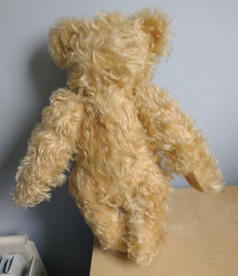 The bear's torso is slightly bloated and its limbs are set at somewhat angular joints. The joints turn with quite a lot of resistance. The soles of the feet are a darker felt, very rough in texture.