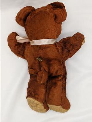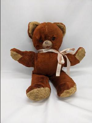 An old teddy bear with plastic eyes and a plastic nose and mouth piece, it has furrier feet, hands and ears, and is musical, it plays the tune Rudolph the Red Nosed Reindeer, although it doesn't seem to be a Christmas themed bear, it has a pink satin ribbon around it's neck. The main color fabric is a short reddish brown fur, the hands, ears and feet are fuzzier fur, in a tan color. There is evidence of some hand stitching and/or repair, and a slight crack on the plastic nose/mouth piece, but otherwise, in good condition for the age. There are no tags, buttons or makers marks that I can see. He is about 14 inches tall, and about 11 inches across his armspan.