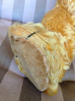 I found this bear at a local rubbish dump and rescued him. He is about 50cm from top of head to toes, his head, arms and legs fully articulate, his filling is crinkly, his muzzle is rough, he has a hard oval item under his tummy, his hand and foot pads are velvety to touch, he has hard eyes (brown iris with black centre), sewn brown nose and mouth, his foot pads are hard but hands are soft, his fingers and toes are delineated with dark stitches, he is in good condition with even fur of golden colour. No tags.