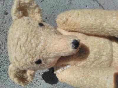 Wearing and he has stitching on his right shoulder. He also has metal discs at the head and limbs . He is lighter and softer but his body is dence with a crackling when you squeeze him. Both have pointed snouts but the blonde has a very pointed snout.