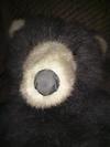 This dark brown bear has lighter tan material for the forward facing part of each ear, the snout, and bottoms of the feet, but not on the forepaws, which are all dark fur like the body & limbs. The eyes are featureless, black plastic and there does not appear to be any mouth, toes, claws, etc. The tip of the nose is a darker brown faux-leather material with slightly rough texturing and sewn dimples for nostrils.