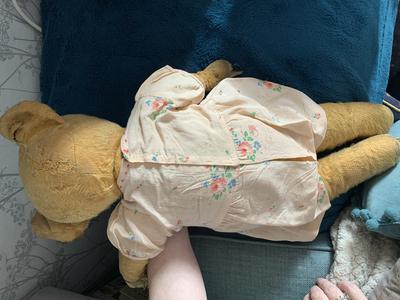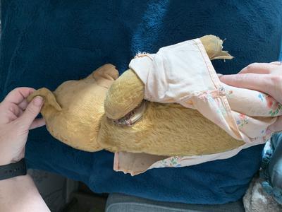 Found in a cupboard whilst clearing mother in laws house. She’s 83 and an only child, sadly we can’t ask her the history. Bear is very threadbare but would have been golden in colour. She’s 5 way jointed and the discs look to be made of thick cardboard. She has glass eyes and a stitched nose. The snout is quite pronounced and with her ears she’s approx 21” in height. She’s dressed in a peach coloured (with floral pattern) ‘cotton’ dress which is stitched together to form a gusset.