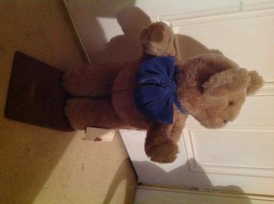 I recently bought "Toots" from an outback Queensland opportunity shop. He was in the shop window and had a $4 pricetag. I was drawn to him by the odd angle of his head - before I understood that he is a door stop bear and needs to hold his head at this angle to look around a bit - otherwise he would just be staring at the door. He is about 19 inches (48cm) tall. He is mounted on a wooden wedge and has a wooden rod going through the soles of each foot, up his hind legs and into his tummy. He is very stable and does a great job as a doorstop. Written on the base of the wedge is 'STRATTON' DOOR STOP BEAR '93. He has a faded cardboard tag which advises that he was designed by Keith Hamilton, and also says "Toots", which I am presuming is his name. He has a little white fabric tag with red writing sewn into his side seam, just below his armpit. The tag shows "oots" (perhaps the T is inside the seam, and so really says Toots). I think his eyes are glass, black with orange rims. He wears a blue neck tie which feels like velvet. He has a cute little tail, a stitched on black nose and mouth. His fur is soft but he is stuffed very firmly and stands rigidly so has not been made to cuddle - he was definitely designed to be a hard working door stop bear! He is in good condition and I have not wanted to damage him to see what he is stuffed with, however he does not feel crunchy. His arms feel as if they might be reinforced with wire. His tummy is very rounded, and his head seems a little misshapen but that might just be because his head is turned. Although I have only had him a short time I have already grown very fond of him as he is such a character, a bit sad, a bit puzzled looking, yet seems to take his role as a door stop very seriously. I would love to know more about dear Toots. Toots also deserves to know more about his background and we would both appreciate any information from readers. Thank you very much.