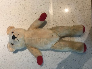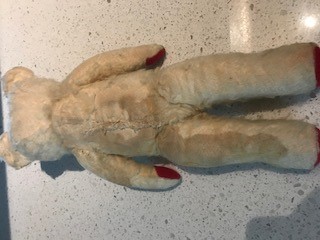 This little guy is about 12 inches tall, has a soft body and straw or harder material in his head head. He once had a music box in his belly but he was washed once in the washing machine and it was ruined so it was removed. He has glass eyes and an inverted V or Y Mouth. His Fur is Mohair not synthetic. His pads are felt and they have no claw stitching.