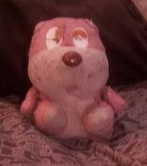 Have had this 'bear' (I called it a tasmanian devil since I was 3 might be a chipmunk etc not sure at all) since I was 3 (1989) was previously owned. He has always been a dusty pink colour, his belly and muzzle white, and the bottoms of his feet a 'blue' tone. his inner ears flip up, to reveal a blueish purplish fabric (not the short fur like the rest of him almost like a high end smooth fleece)