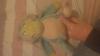 Had yellow mittons and hes eyes was looking to the left from hes prospective around 25cm roughly has pink pads on bottom of feet as well