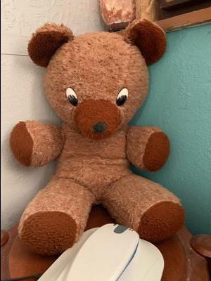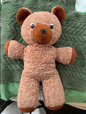 This bear has been in my mothers possession for nearly 50 years. He is about 24 inches tall, he makes a crunch sound when you squeeze him, his nose was made of embroidery thread but it wasn’t stitched on it was glued on (strange, I know), he used to have a felt tongue, not the typical stitched upside down Y shaped mouth. He has no tag currently and he never has. Her parents gave it to her around 1970 but we don’t know where they got it. His fur has always been like this, it’s not matted. He used to have a cream coloured satin ribbon around his neck. He also has very wide thick seams. I’ve seen some cubbi gund bears and knickerbockers that are a pretty similar shape and concept but the colour pattern is never quite right or the eyes. If anyone knows where he came from I would greatly appreciate the input.