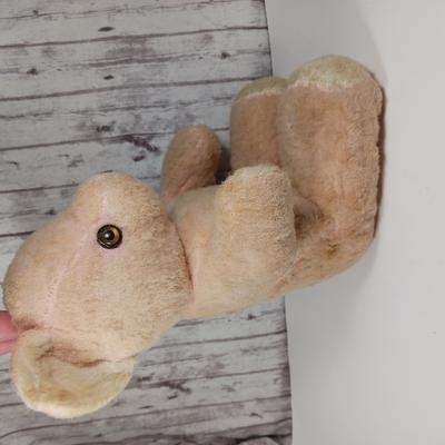 This cutie is a vintage pink and white bear with jingle bell in her left ear. She's in a seated position. I think those are glass eyes, but I'm not sure how to tell. Also, I have not found out who the maker is. Any guesses? Possibly from the 50s.