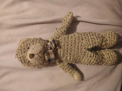 Hello! I have had this bear since I was very little. I got him at a garage sale, so I have no clue how old he is. I ripped the tag off when I got him because I was a little kid and the tag annoyed me, so I have no way to find out who made it or where it's from. His stitching is something I haven't seen before, with the weird striped all along his body. There seems to be beads/beans in the bottom of his torso, but the rest of him seems to be stuffed with some kind of fluff. His bowtie can come undone, and it's not in its original state (I got bored and untied it and couldn't put it back exactly right). I honestly just want to know what kind of bear this is. It's a very special item to me and I want to know if anyone else could have a bear like this. I have never seen one like this.