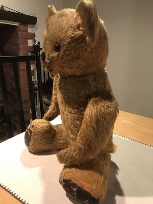 She is made of sparse Gold mohair, wood wool filled, fully jointed, original amber glass eyes with a replaced growler.”
